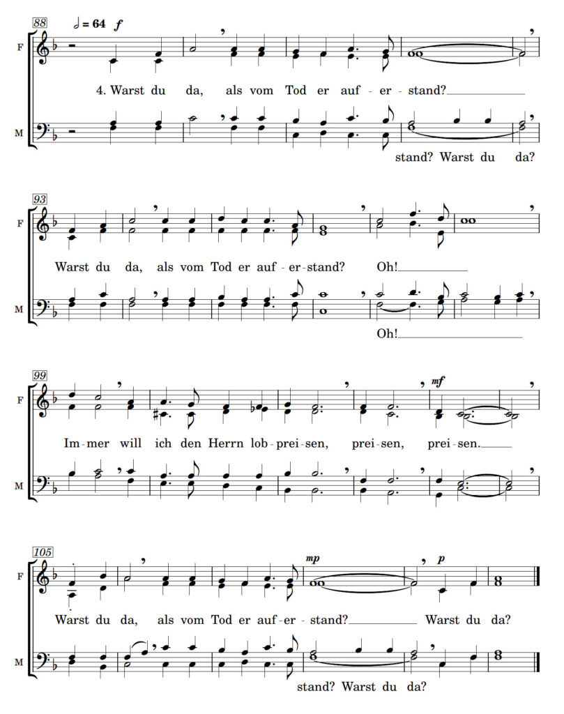 Diese Strophe handelt endlich von der Auferstehung Jesu und wird von Frauen und Männern gemeinsam 4-stimmig gesungen.